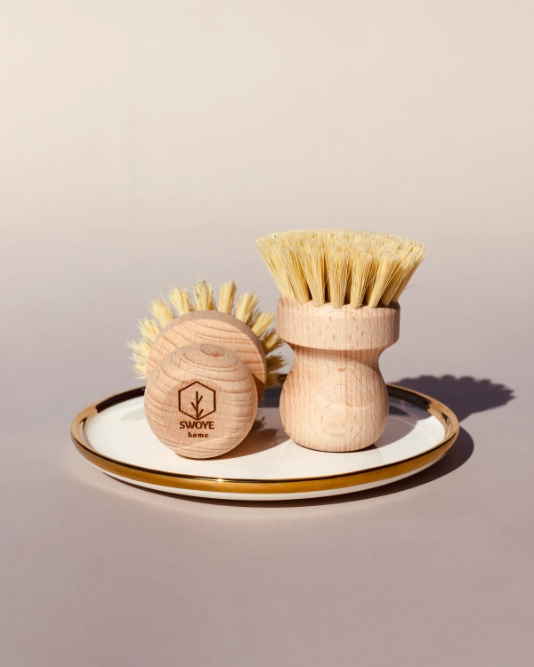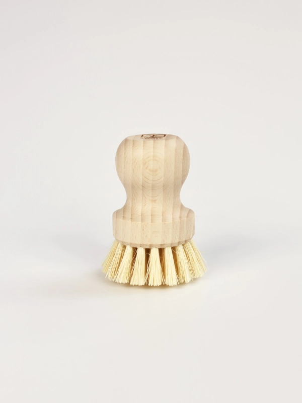 Naturalna szczotka do mycia garnków wykonana z drewna bukowego oraz z tampico (włókna z liści agawy).