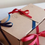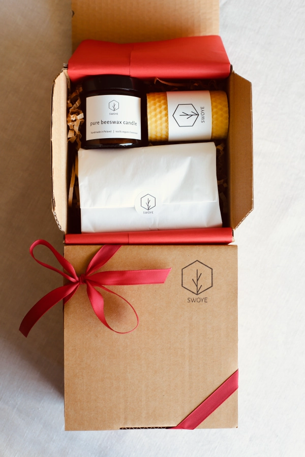 Świece z wosku pszczelego starannie zapakowane w pudełko upominkowe i zapieczętowane elegancką wstążką.